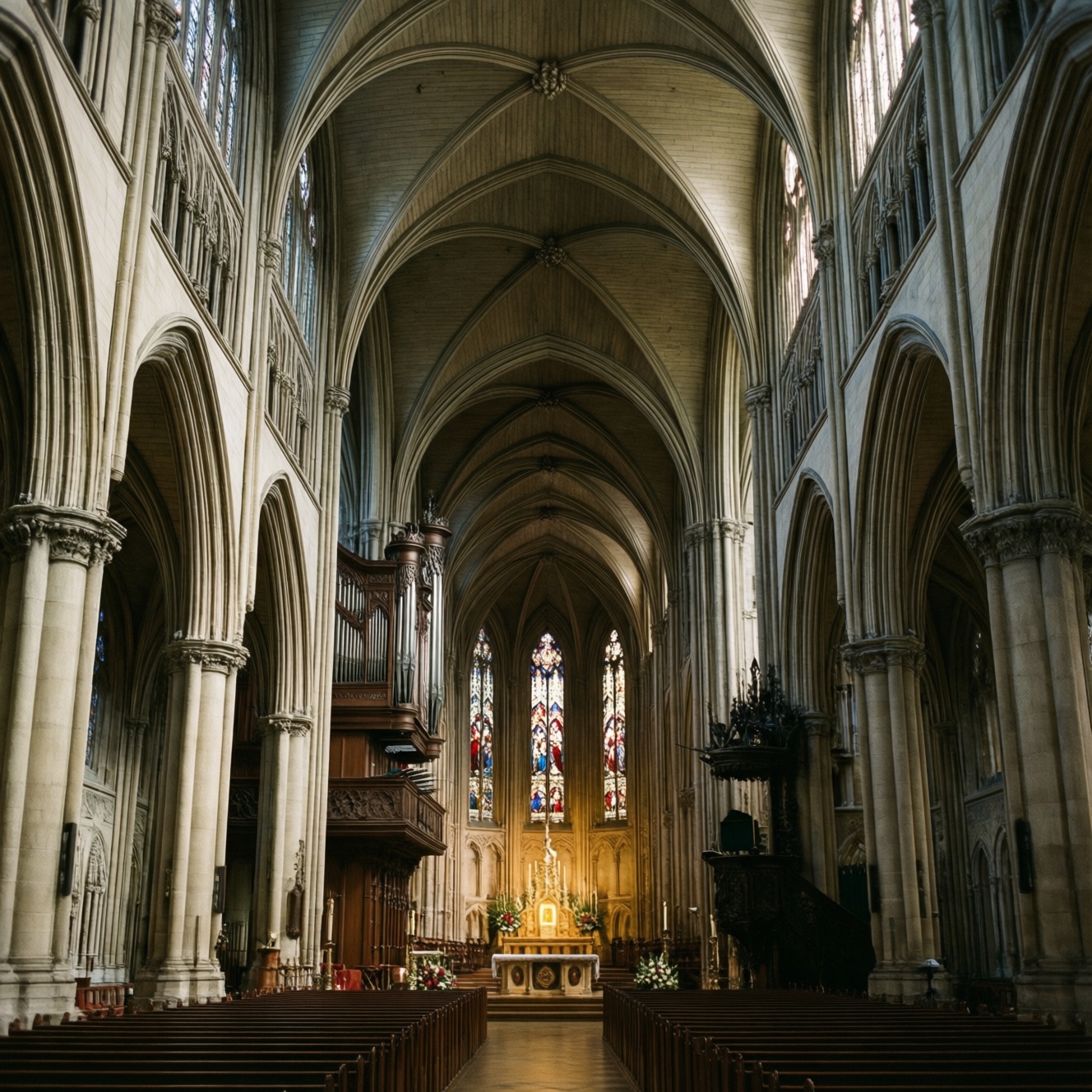 Католический собор изнутри читается как система зон: нефы (navis) ведут процессии и распределяют поток людей, капеллы дают место частным молитвам, пресбитерий с алтарём организует литургию, витражи передают богословские смыслы через свет, а орган с хорами формирует акустическую "архитектуру". Разобрав термины, вы начнёте видеть логику пространства.