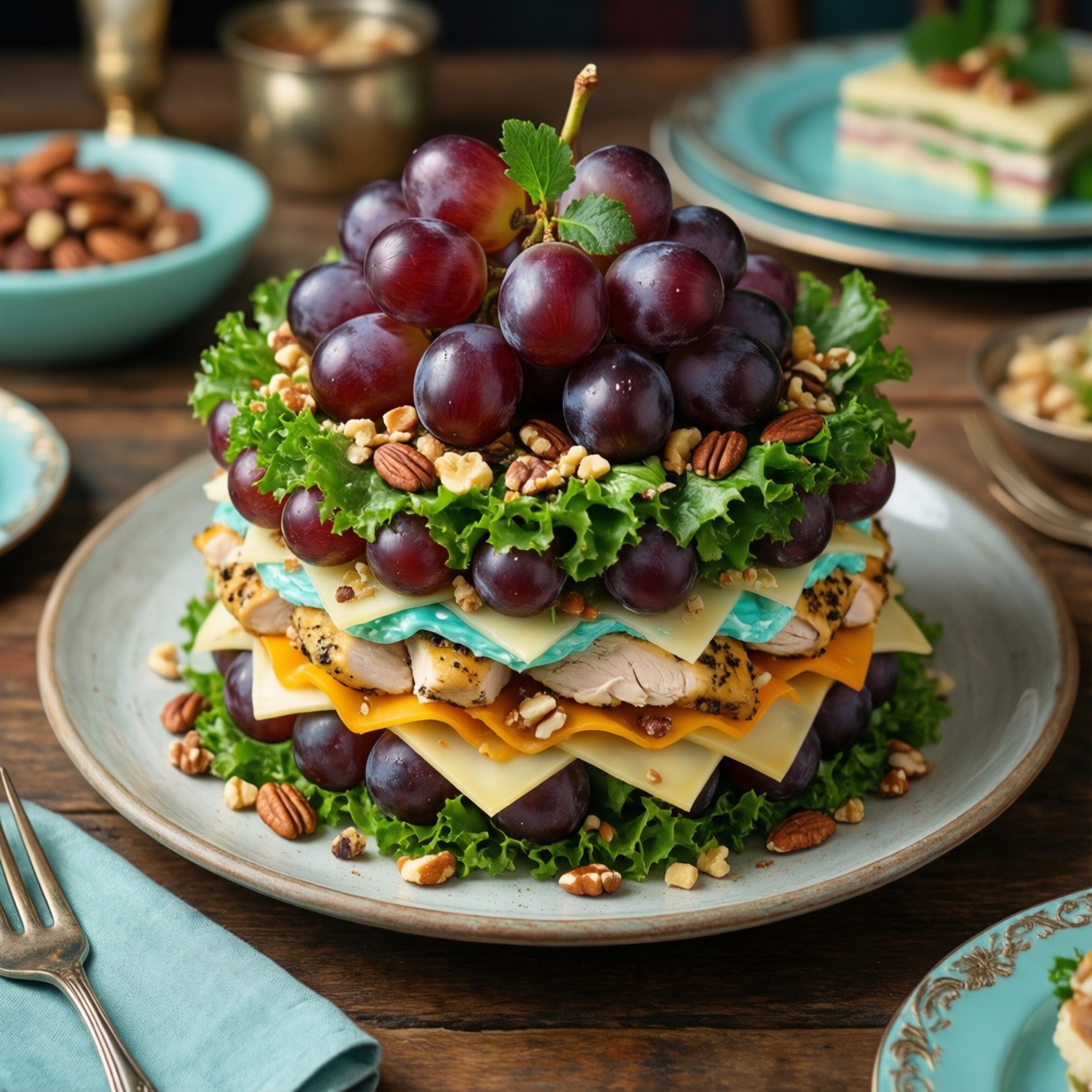 Салат «Тиффани» — редкий пример блюда, которое не исчезло вместе с модой на «форумные» рецепты начала 2000‑х, а, наоборот, закрепилось в праздничном меню. Его полюбили за парадный вид и понятную, но эффектную вкусовую механику: нежная курица, солоноватый сыр, ореховый хруст и сладкая свежесть винограда собираются в одну композицию, которая выглядит нарядно даже на самом простом